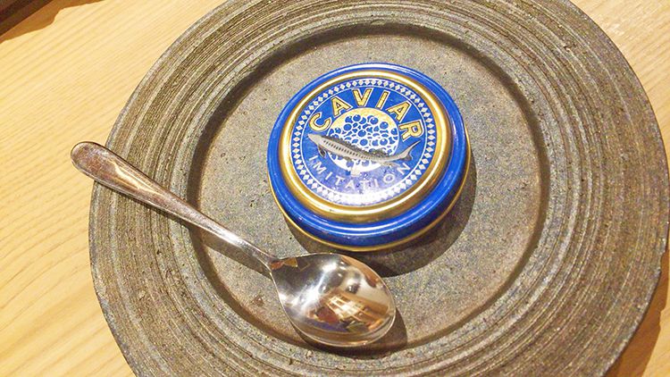 299円なら冒険してみたいと頼んでみました。運ばれてきてビックリ、缶で登場です。キャビアの下にイミテーションと記載されていますが、魚の絵はチョウザメ。でも、ダンゴウオの卵です。