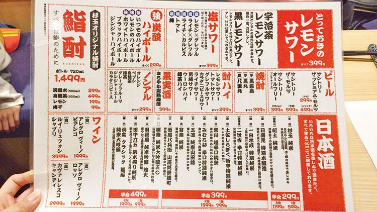 面白くて気になる名前のメニューが多いです。お寿司はもちろん、居酒屋王道のメニューも豊富です。天麩羅や、あさりラーメン、まぐろうどんなどもあります。