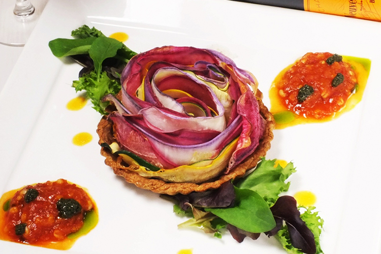 お店の一番人気メニューという、有機野菜の彩りタルト 1058円(税込)は野菜の薄切りをバラの花に仕立てた、見た目に美しい一皿。