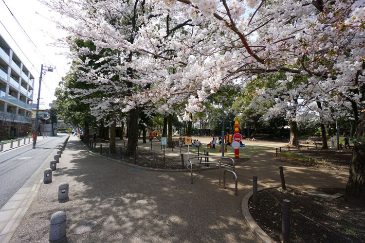 杉並区立馬橋小学校と隣接していて、グランド沿いの桜が美しいだけでなく、水辺の広場の風情ある池や遊具が中心のちびっこ広場、小さい子どもも安心して遊べる水遊びの場などもあります。