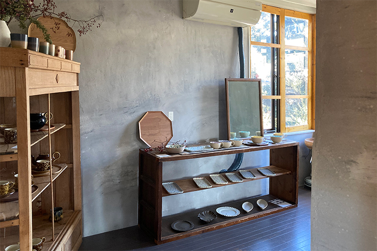 コンクリートの壁と木のアンティーク棚に、たくさんの器が心地良くなじむ空間「mist∞」