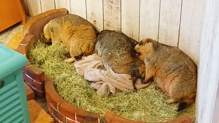 このときに出勤していた4匹のヒマラヤマーモットたちはすやすや眠っていました