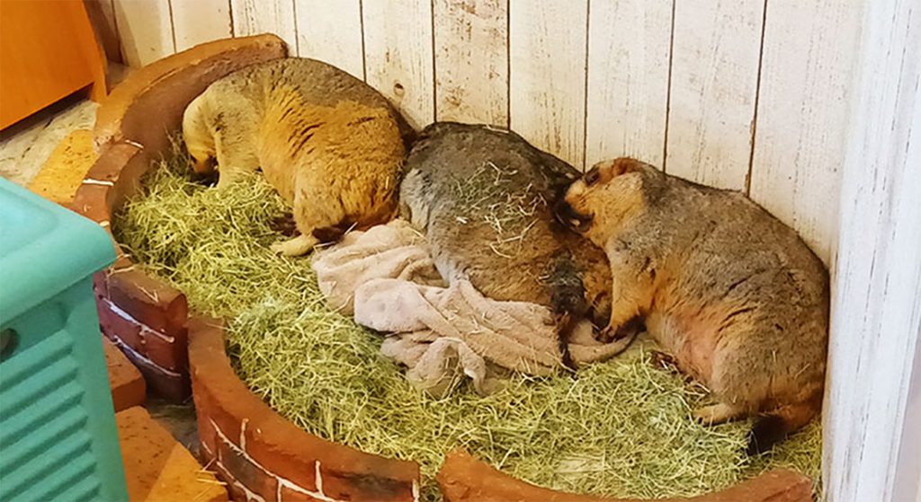 おやつを食べたらすぐに眠りに入るマーモット達。