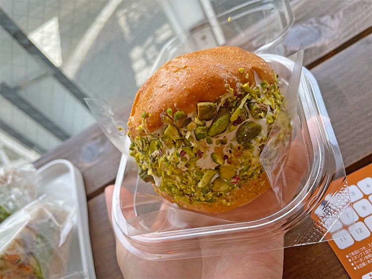 手のひらサイズでかわいらしいですが、これでもかと甘さ控えめのクリームとクランチされたピスタチオがたっぷり詰まっています!