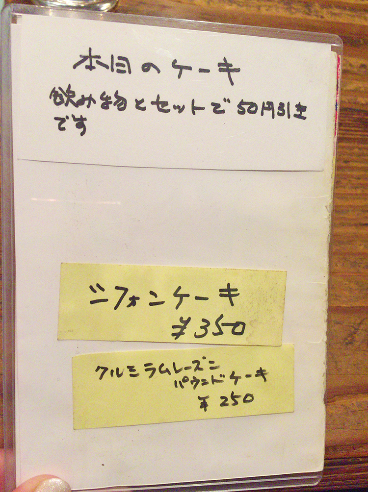 手書きのメニューに高すぎない価格設定。軽食やシフォン・パウンドケーキが楽しめるのも喫茶店の良さですね。