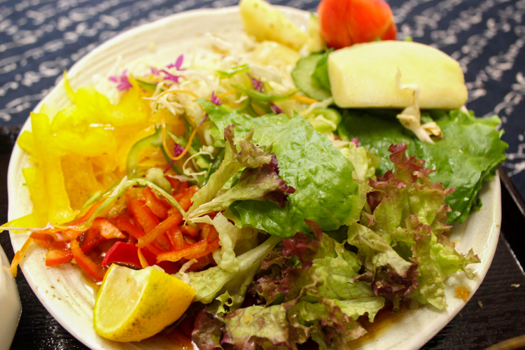 かなり食べたはずなのに、お皿にはまだこれだけの量が! キャベツ、パプリカ、赤ピーマンに、じゃがいも、キュウリ、ニンジン、ロメインレタス、トマト、万願寺唐辛子、エディブルフラワー…。洋ナシもありました。これだけの種類の野菜&果物が一度に食べられる機会なんて滅多にないですよね? 日ごろの野菜不足も一気に解消できてうれしい~。
