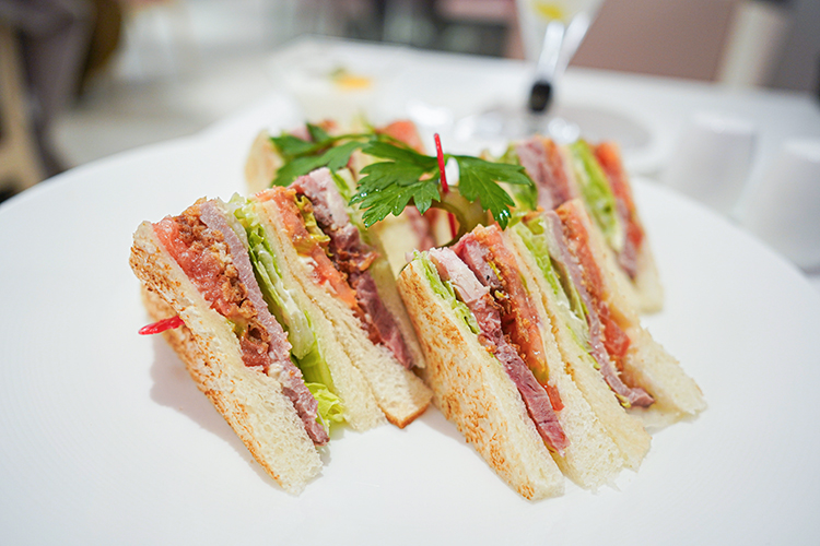レホールマヨネーズを効かせたローストビーフにトマト、レタスとフライドオニオンを合わせたサンドウィッチ。