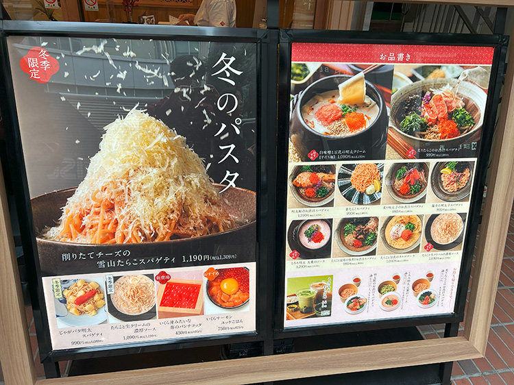 店頭にはメニュー写真が掲載された看板があり、たらこスパゲティ専門店であることが一目で分かります。入店前にある程度メニューが決められますね。