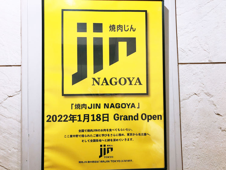 エレベーターを降りると名古屋のお店がグランドオープンしたお知らせがどどん!とポスターが貼られています。こちらのお店は店名が元々「焼肉JIN」でしたが、名古屋にも出店されたということで東京がついて「焼肉JIN TOKYO」となったそうです。