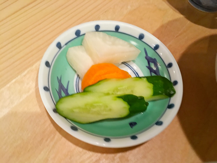 こちらは付け合せの小鉢と漬物。こちらもしっかりめに味付けされていました。