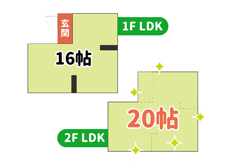 さらに、1階だと玄関・ホールが必ず必要になり、その部分で約4帖分必要になります。同じ条件の土地に建築するとして、仮に1階にLDKがある間取りで(LDKが)16帖の広さを確保できるとしたら、2階LDKにすることで約20帖の空間をつくることができます。