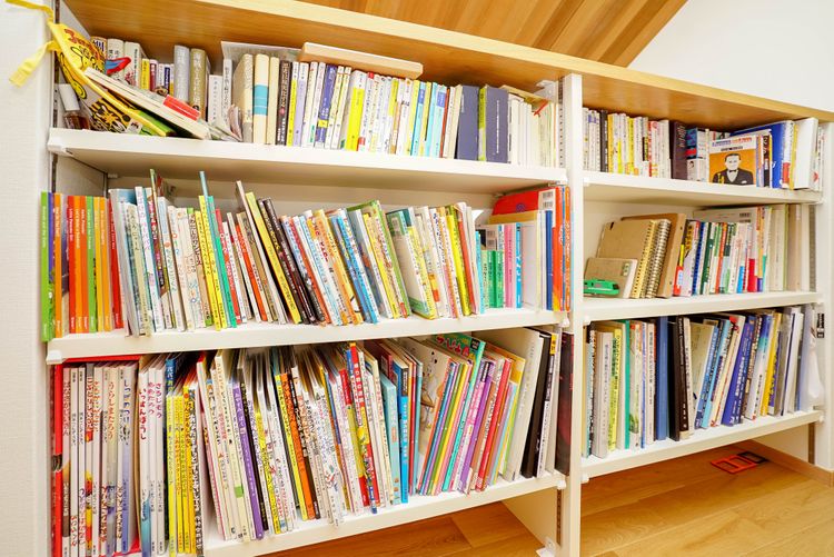 物が多いので収納も重視しました。玄関や廊下、リビングにも大きな収納を造ったし、階段を上がってすぐのところには本棚も作ってもらいました。